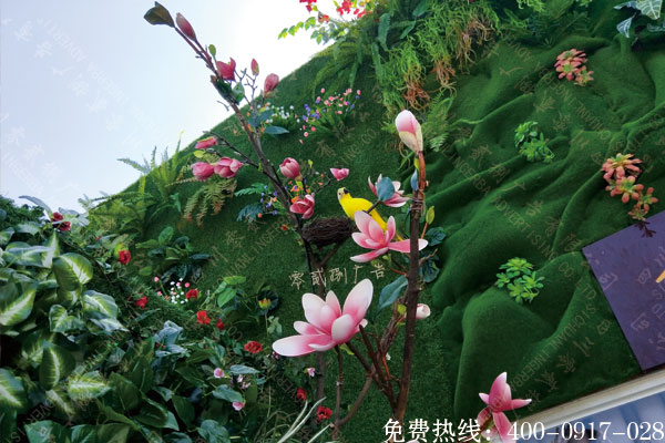 7、安装完围墙栅栏仿真模拟假草坪后,可以在上面钉上宣传词个性字体或者图案等。