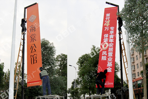 成都道旗喷绘 道旗喷绘简介:道旗又名灯旗杆,一般是指安置于道路两侧、活动场馆附近的路灯灯杆等物体上的广告、宣传媒体。属于户外广告媒体的一种。